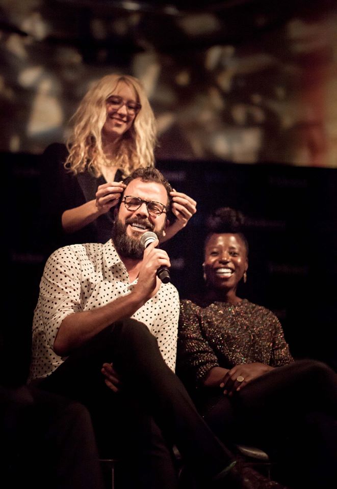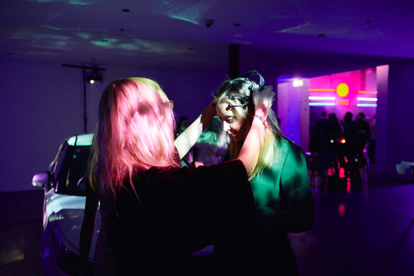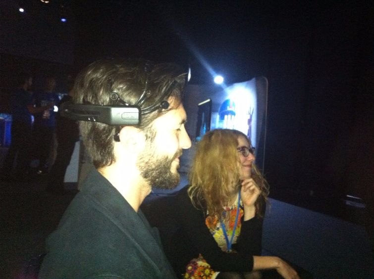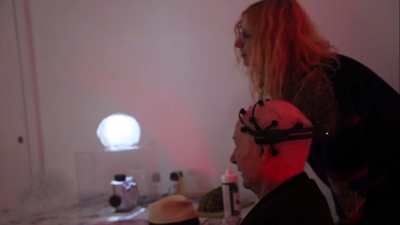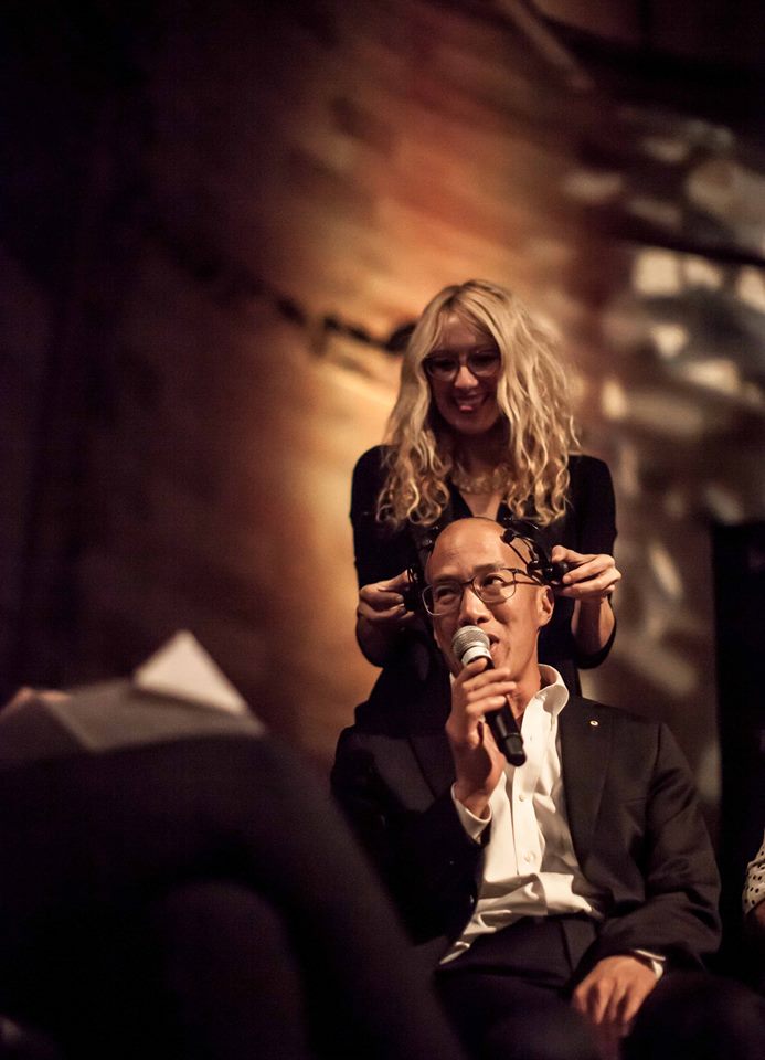 Laura Jade fitting the EEG onto Elizabeth Blackburn (Nobel Laureate in DNA telomere research) next to Brian Eno (Musician, record producer), Robert J Sawyer (Sci-Fi writer).