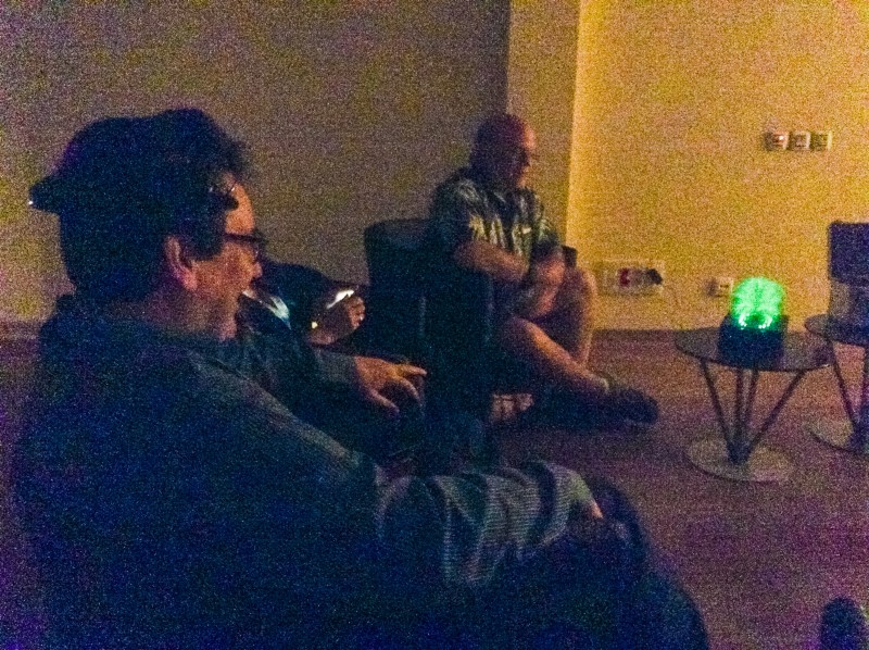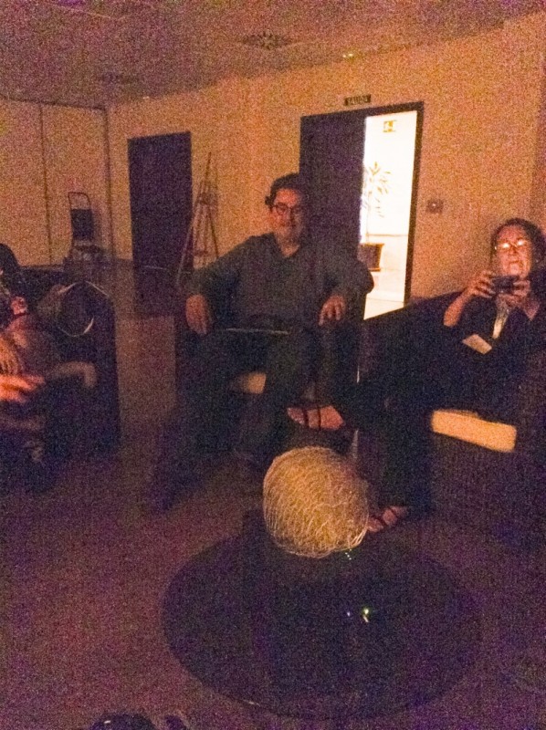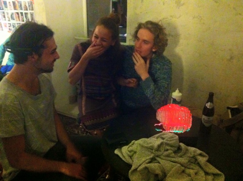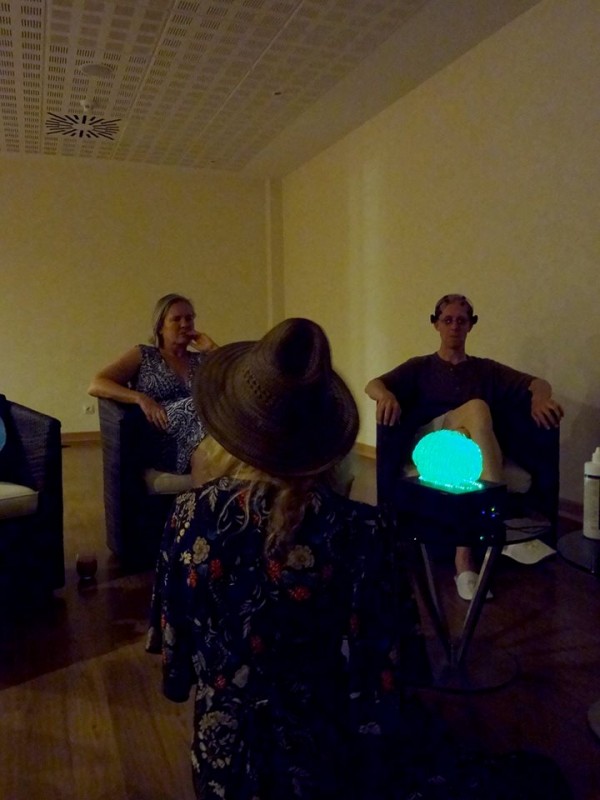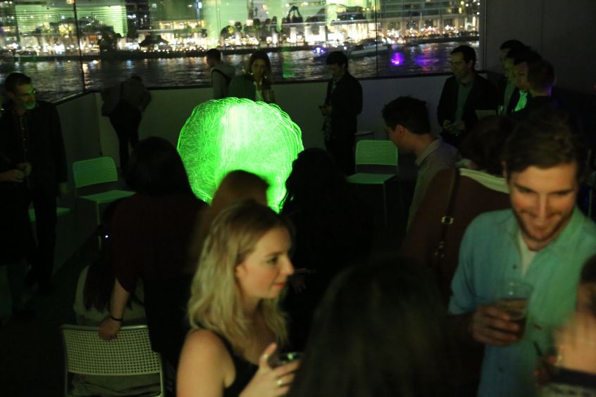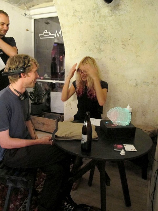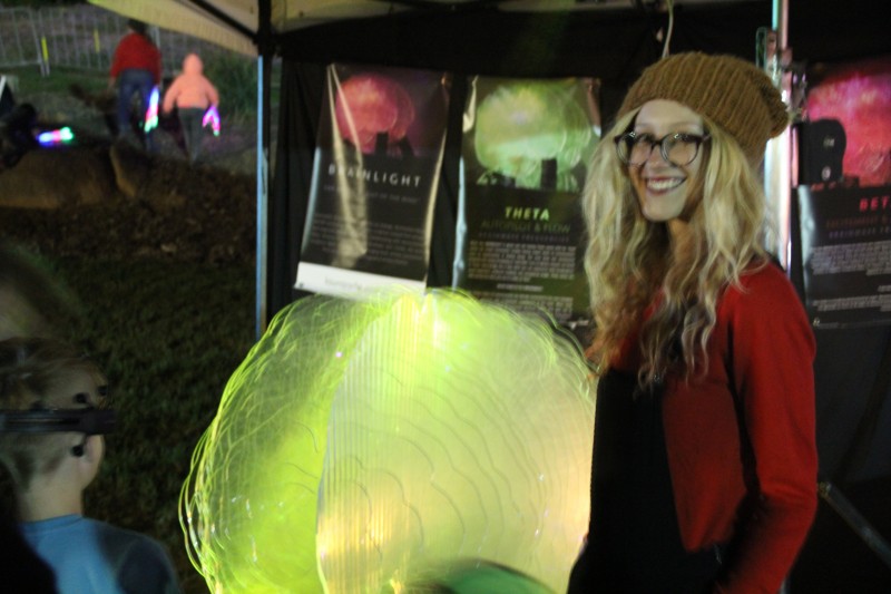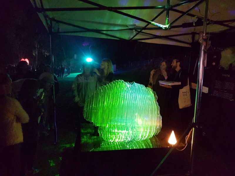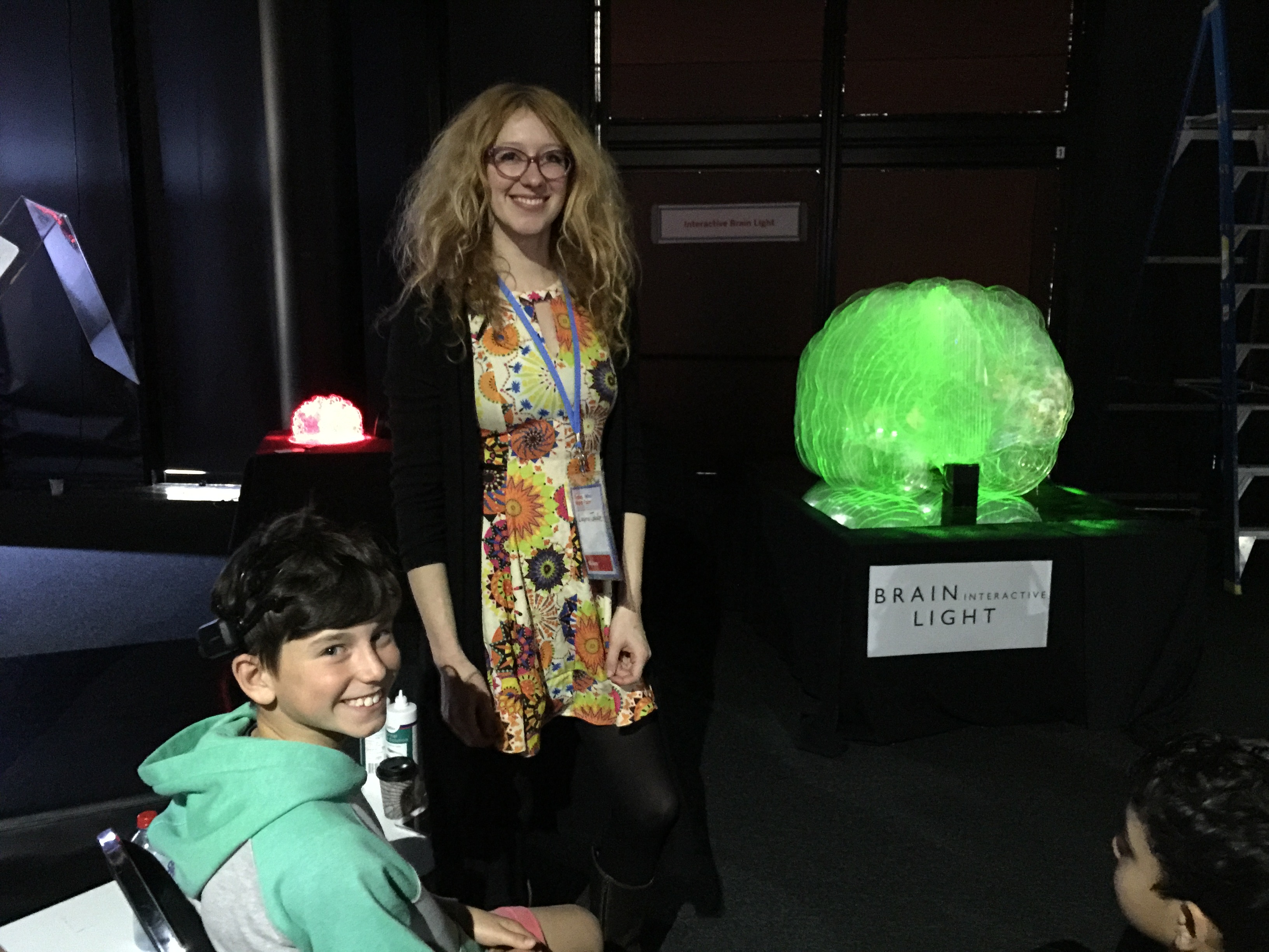 Laura Jade demostrating her minature interactive Brainlight to Joel Parker (astrophysicist and manager on New Horizons, Rosetta Mission) and his partner Kim Hansen.