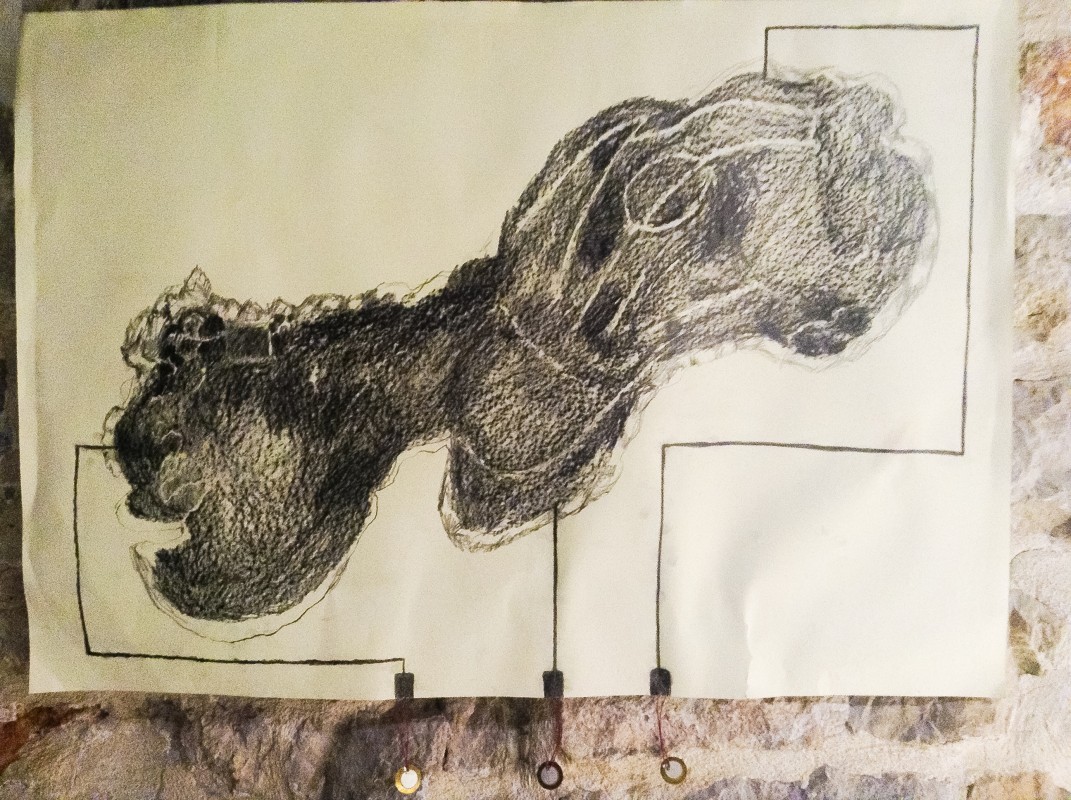 The projection of the water surrounding the island is displayed over a graphite topographical drawing of the island. The drawing works as a capacitor sensor with Arduino and becomes sensitive when touched with your fingers and effects the sound frequency levels. This encourages audiences to connect and play with the drawing of the island and in turn create their own “energetic curse” as their fingers explore the geography.