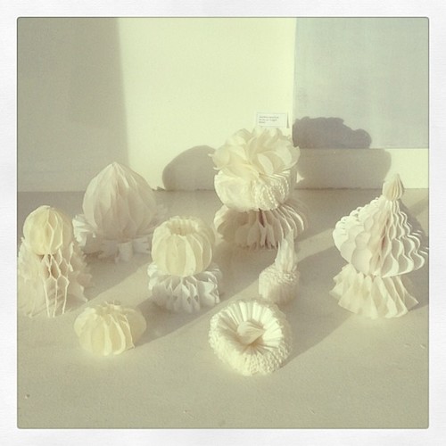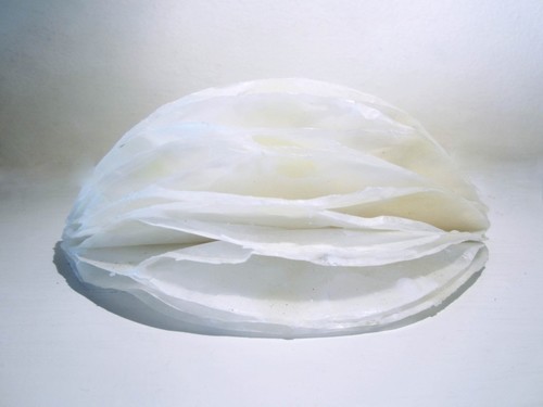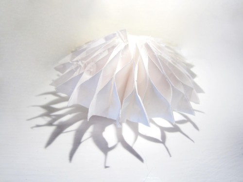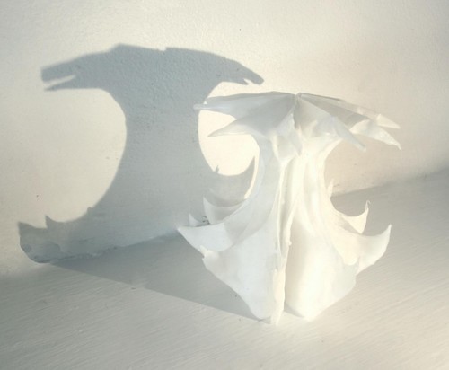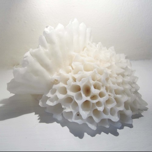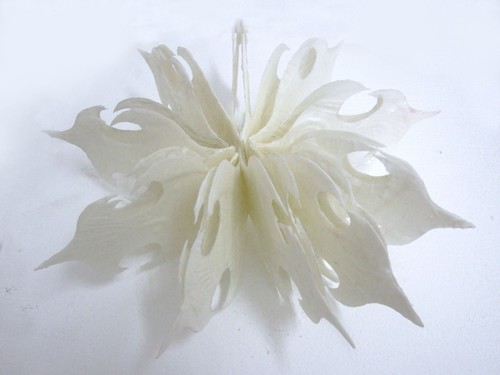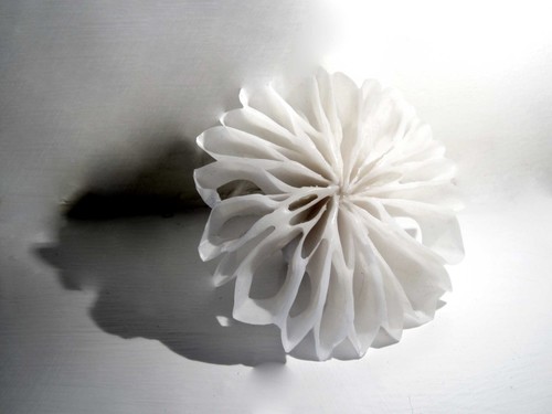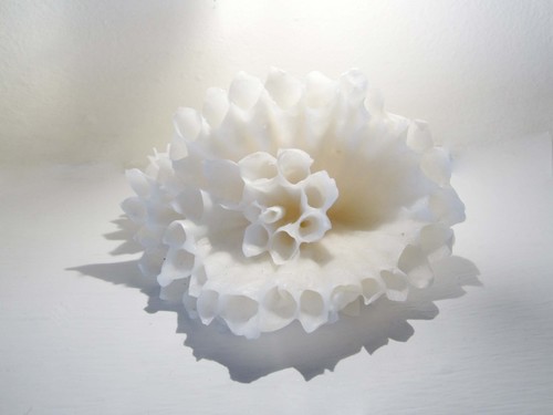WHITE PARAZOA II 2012 White Parazoa II is part of a series of small paper and wax sculptures inspired by the Elizabethan era. The geometric forms reference the designs of neck ruffles and lace of the period, while also referencing the appearance of cabinets of curios and the rise in scientific discoveries in the 16th-19th Centuries. The work also draws upon ideas in the illustrations of biologist Ernst Haeckel in “Art Forms of Nature” focusing on sea creatures and the array of symmetrical and geometrical patterns found in living organisms.